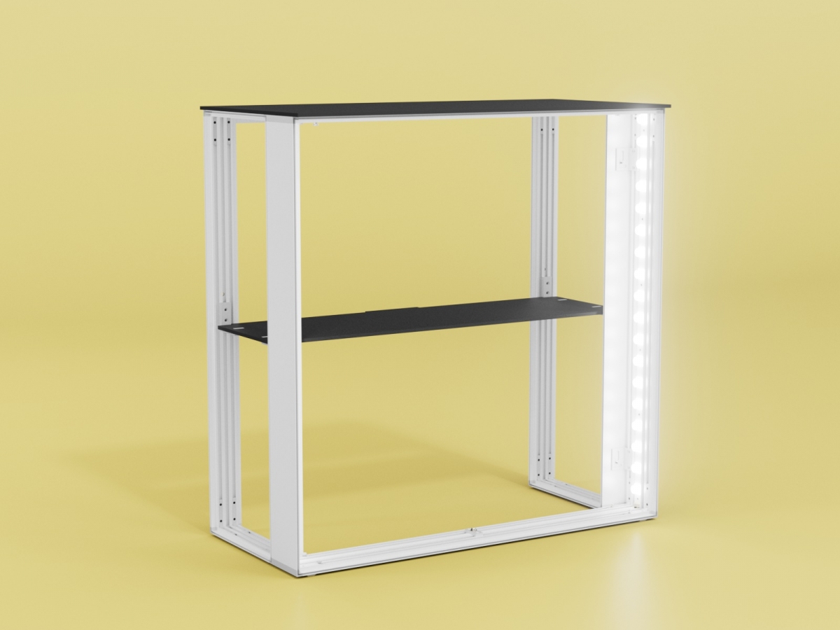 Dieses elegante LED-System ist auf der Vorderseite beleuchtet, in wenigen Minuten aufgebaut und stabil genug, um Ihren Anforderungen gerecht zu werden. Durch das Ablagefach auf der Rückseite steht zusätzlicher Stauraum für Ihre Unterlagen zur Verfügung. Dank unseres patentierten LEDUP-Systems erfolgt die Montage werkzeuglos. Der gesamte Stromverbrauch beträgt nur 30 Watt. Maße des Counters inkl. Standfüße: BxHxT 100 × 101,5 × 48 cm, Gewicht ca. 30 kg.