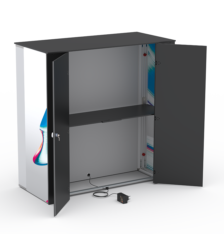 Auf Wunsch kann der COUNTER ONE mit Türen bestellt werden, die per Fingerabdruck verschlossen werden können. Dadurch können Ihre Wertsachen sicher verstaut und vor neugierigen Blicken geschützt werden. Die Türen werden in einem zusätzlichen Transportkoffer geliefert.