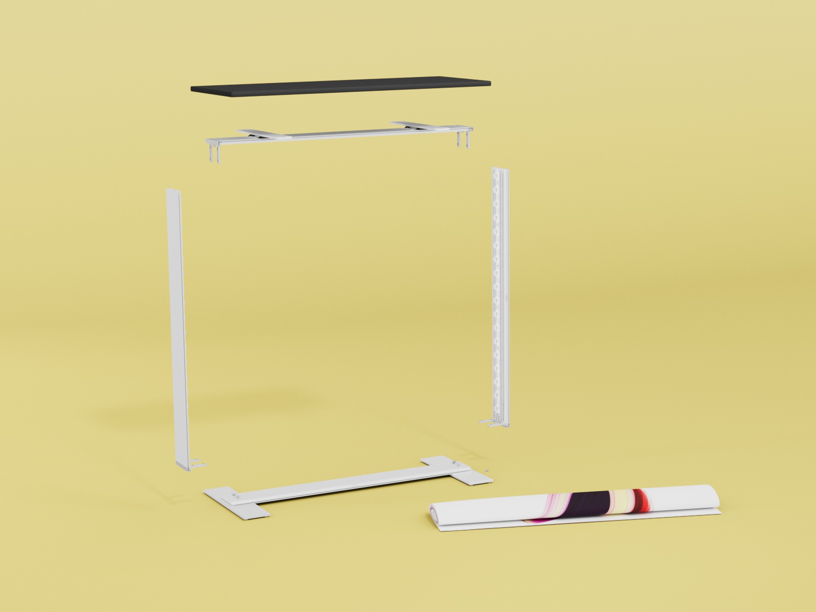 Einfach die Komponenten aus dem praktischen Koffer entnehmen, zusammenstecken, Standfüße anschrauben und das Grafikpanel einsetzen – fertig!