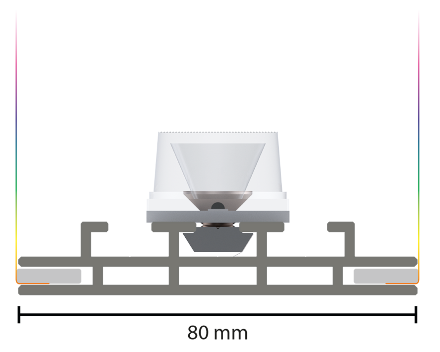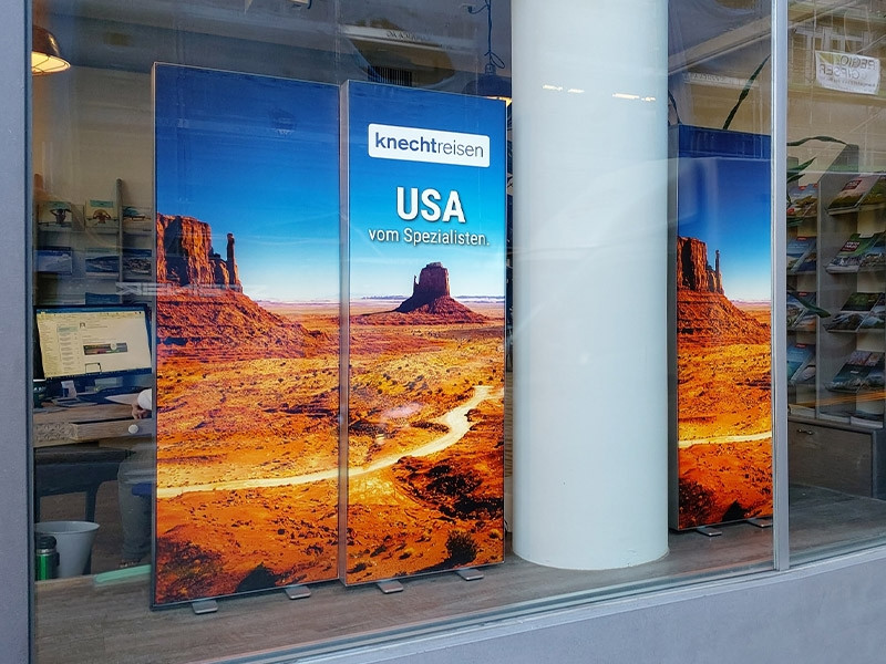 Ein Profil – Profilabmessung (Tiefe) 80 mm – wird für diesen Displayrahmen verwendet. MINI LEDUP® besteht aus hochwertigem, eloxiertem Aluminium und ist UV-beständig. Das Design und die Form sind sehr schlank und zeitlos elegant. Mit einer sorgfältigen Verarbeitung sind selbst die Kanten angenehm zu berühren. Die Verbindungen sind nach dem Aufbau fast unsichtbar. Ihre Digitaldrucke sehen aus jedem Blickwinkel ansprechend aus.