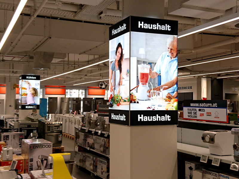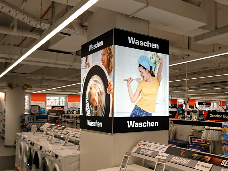 Der Multi Tower Pillar ermöglicht es, Säulen komplett zu verkleiden und schafft somit eine beeindruckende Werbefläche, die durch LED-Hintergrundbeleuchtung noch imposanter wird.
