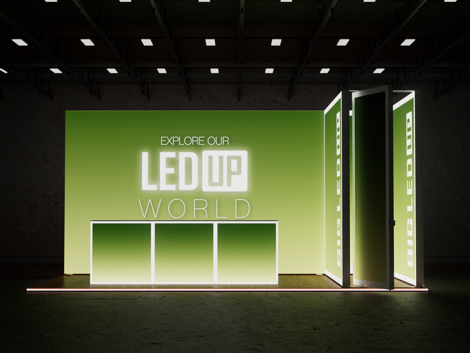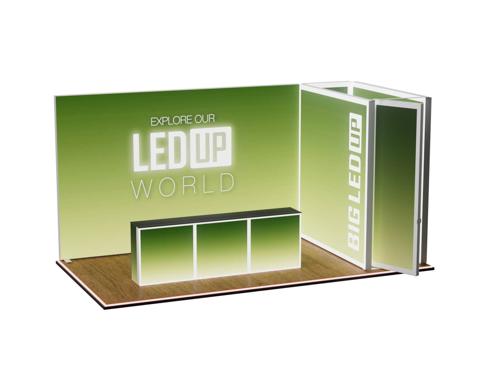Dieses Set ist mit einer Grundfläche von 6x3 m und einer Höhe von 298 cm, sowie drei Counter ONE und einer Koje, ist die für diejenigen gedacht, die einen beeindruckenden und professionellen Messestand benötigen. Dieses modulare Set bietet maximale Flexibilität und ermöglicht es Ihnen, den Aufbau an Ihre spezifischen Event-Anforderungen anzupassen. Ob für Messen, Konferenzen oder jede andere Promotion-Veranstaltung – das BIG LEDUP Set 5x3 DEVON sorgt dafür, dass Ihre Marke durch Klarheit und Stil hervorsticht.