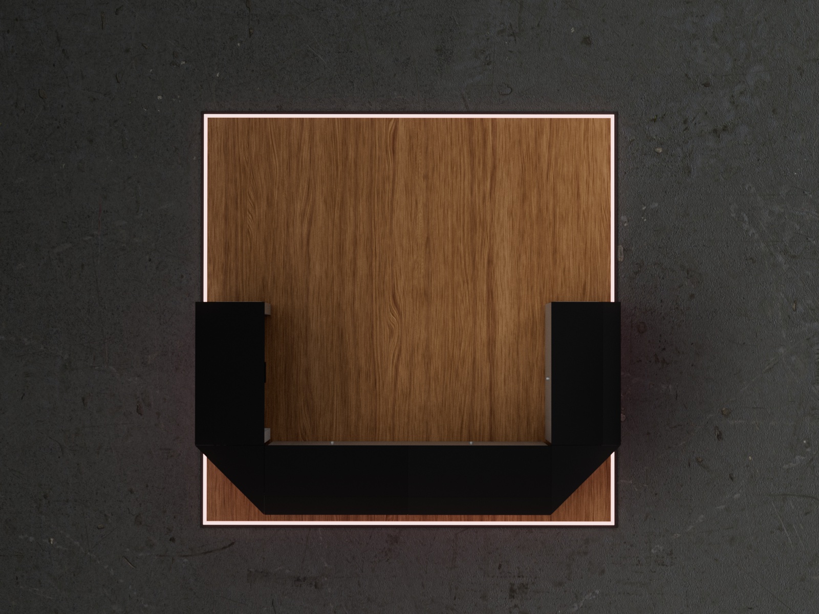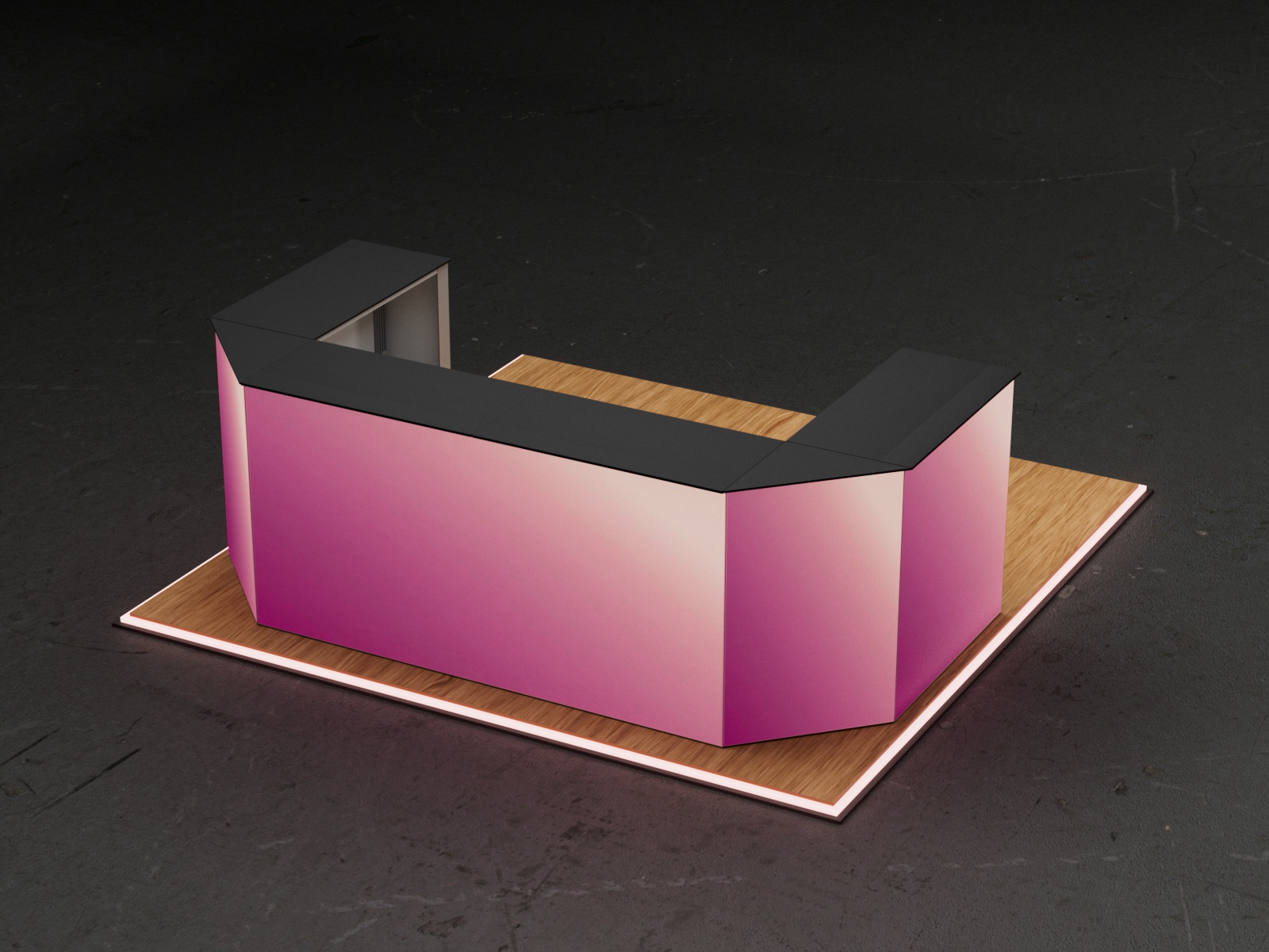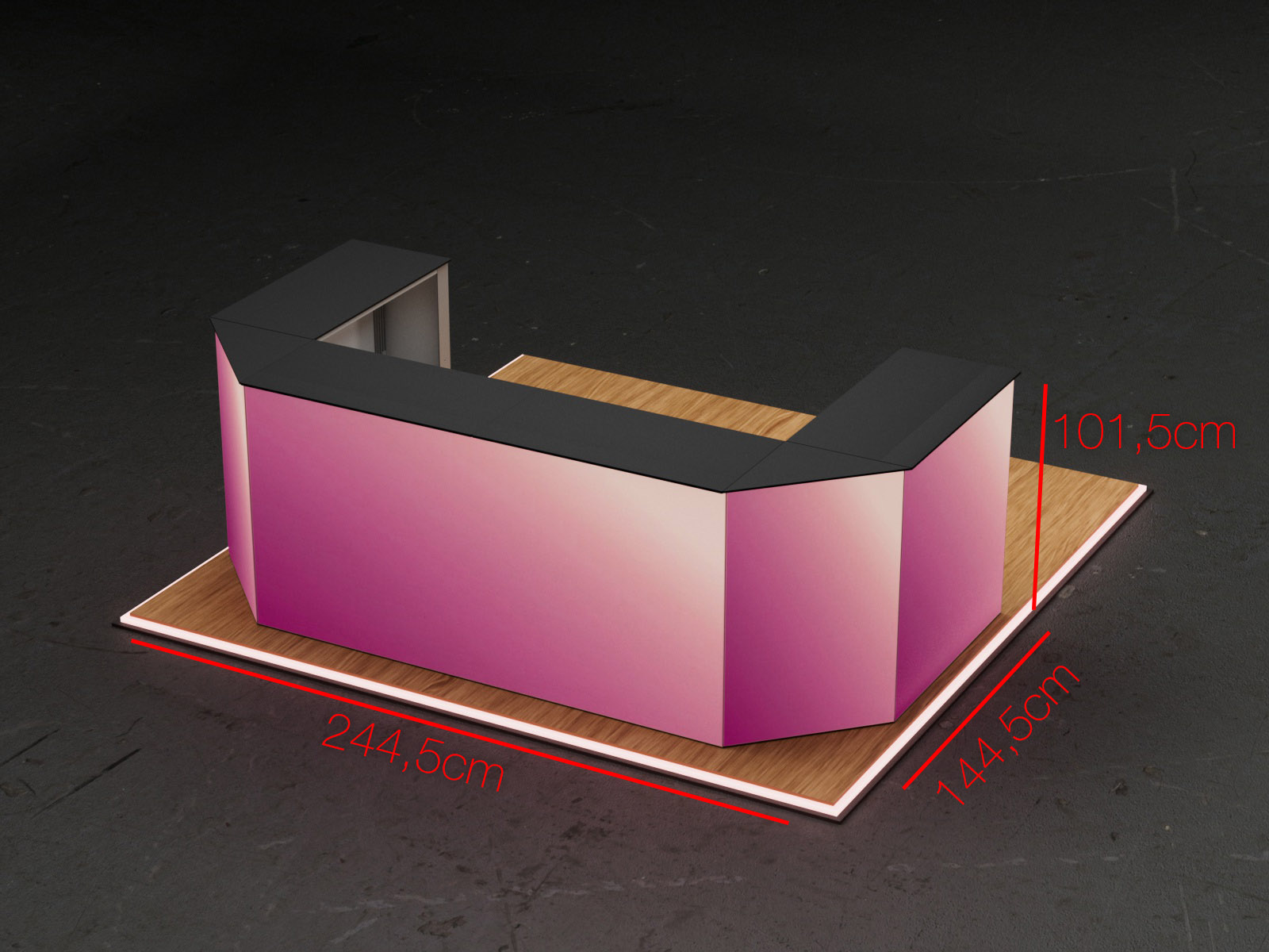 Im Zentrum stehen vier COUNTER ONE Einheiten, ein verbindendes Extension Set sowie zwei Eckmodule, die die C-Form ermöglichen. Die beiden vorderen Counter werden mit dem Extension Set verbunden und benötigen nur eine gemeinsame Frontgrafik – für ein besonders sauberes und durchgängiges Erscheinungsbild.